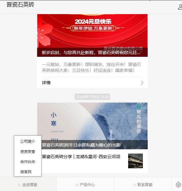 新版網站加強了移動端版本建設,網站頁面展示自動適配移動端屏幕模式,解決了舊網站在移動端訪問兼容性差的問題,使手機訪問更便捷,操作體驗更舒適。另外,新官網還與晉瓷官方微信平臺互聯互通,用戶可通過進入晉瓷微信公眾號,以移動端的方式登錄,閱讀體驗順暢便捷。